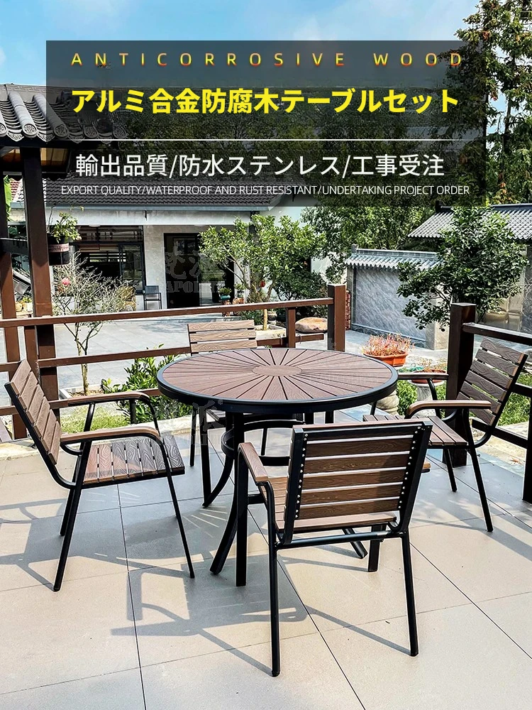 防腐加工の樹脂ウッド製テーブル&チェアセット!庭やバルコニーに最適なアウトドアリビング空間を演出。カフェやガーデンにぴったりのスタイリッシュなデザインで、おしゃれなひとときをお楽しみください。