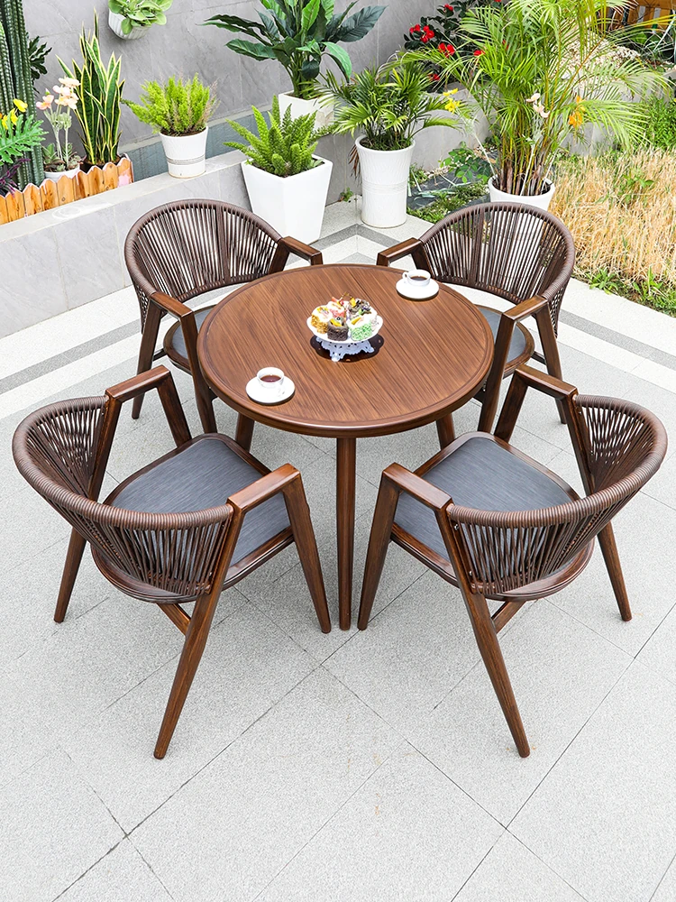 Outdoor Luxury Wood-Plastic Dining Table and Chair Set - Waterproof and Sun-Resistant for Patios, Balconies, and Gardens - Perfect for Entertaining in Style!