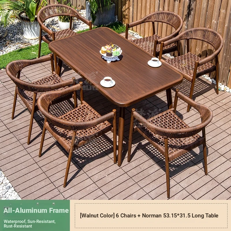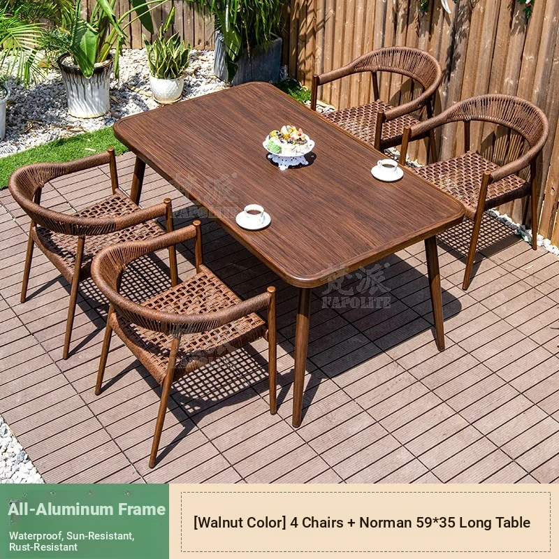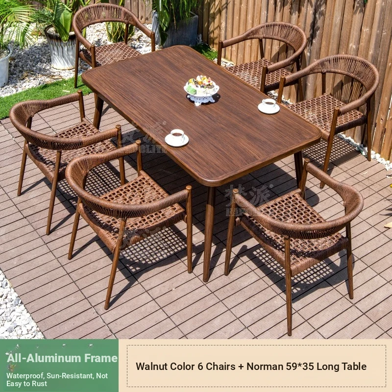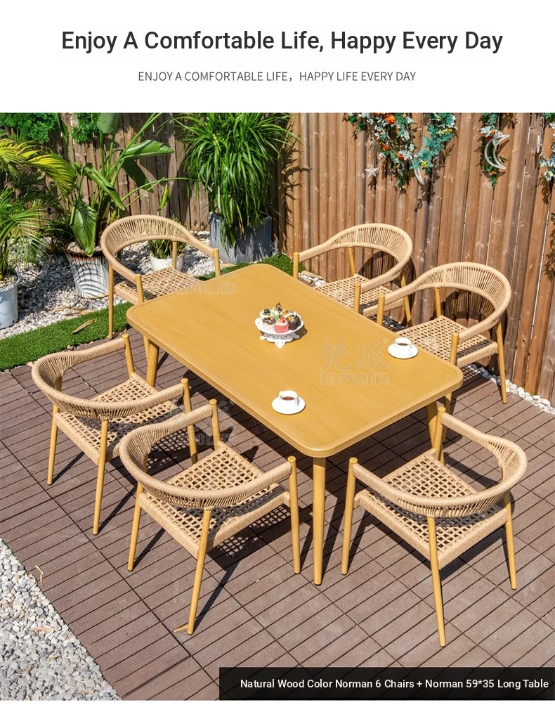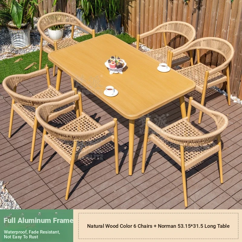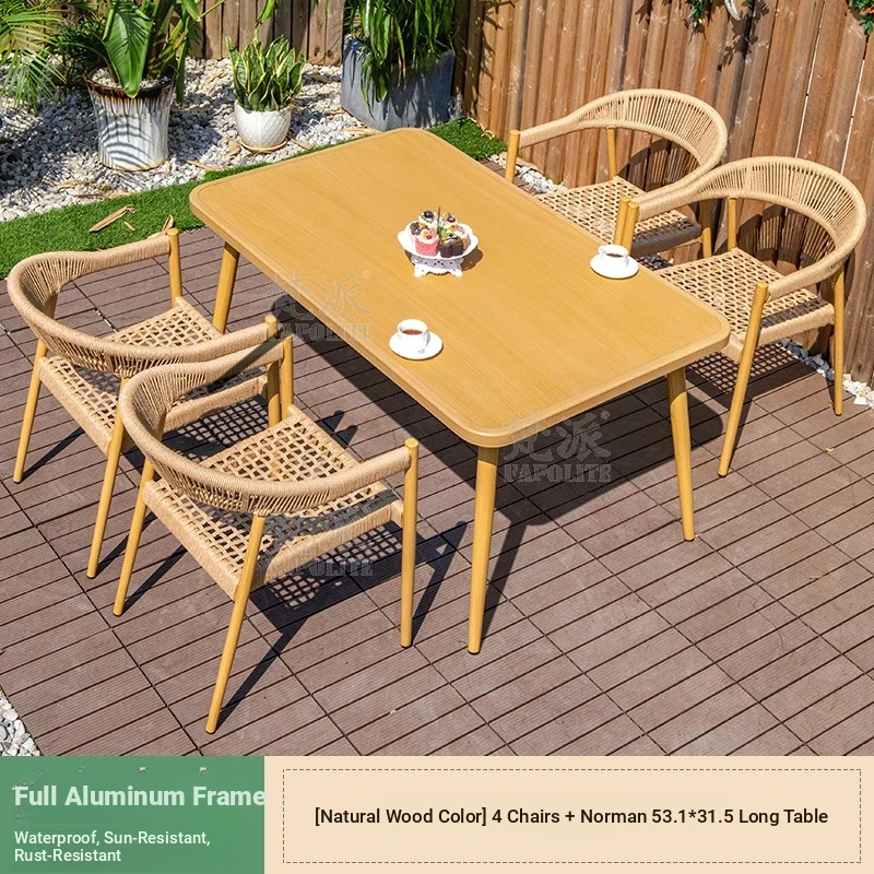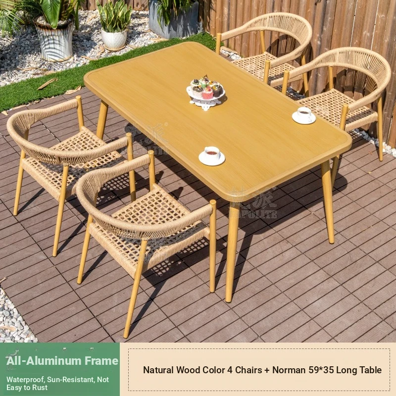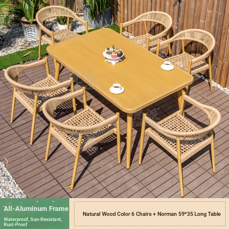 Vibrant Outdoor Patio Furniture Set - Waterproof Aluminum Long Table with Natural Wood Finish and Rattan Chairs for Villa Gardens and Open-Air Spaces