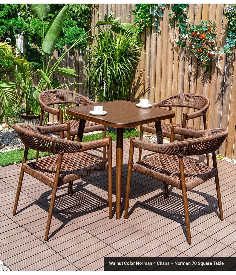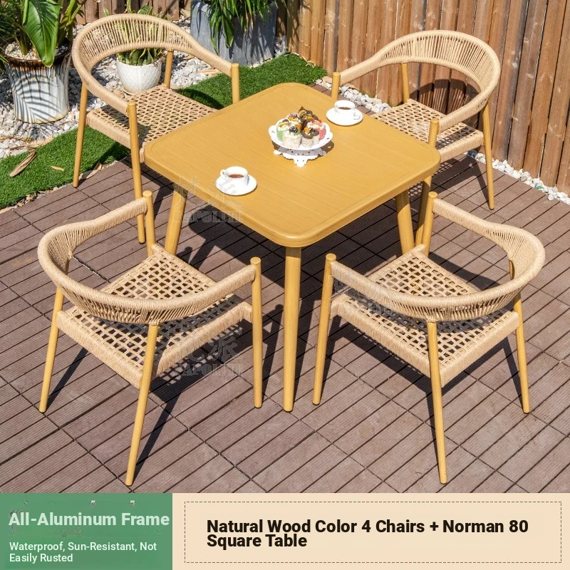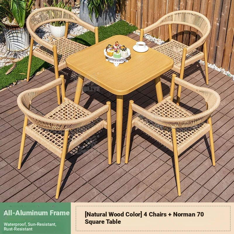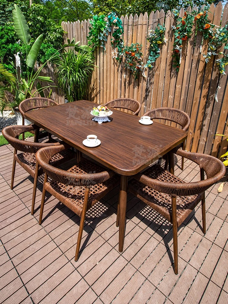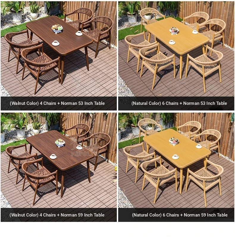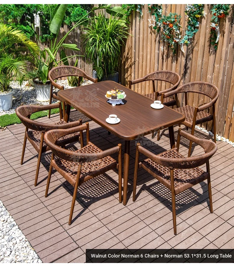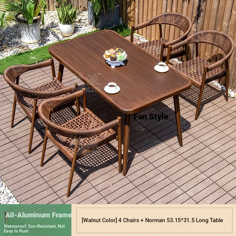 Vibrant Outdoor Patio Furniture Set - Waterproof Aluminum Long Table with Natural Wood Finish and Rattan Chairs for Villa Gardens and Open-Air Spaces