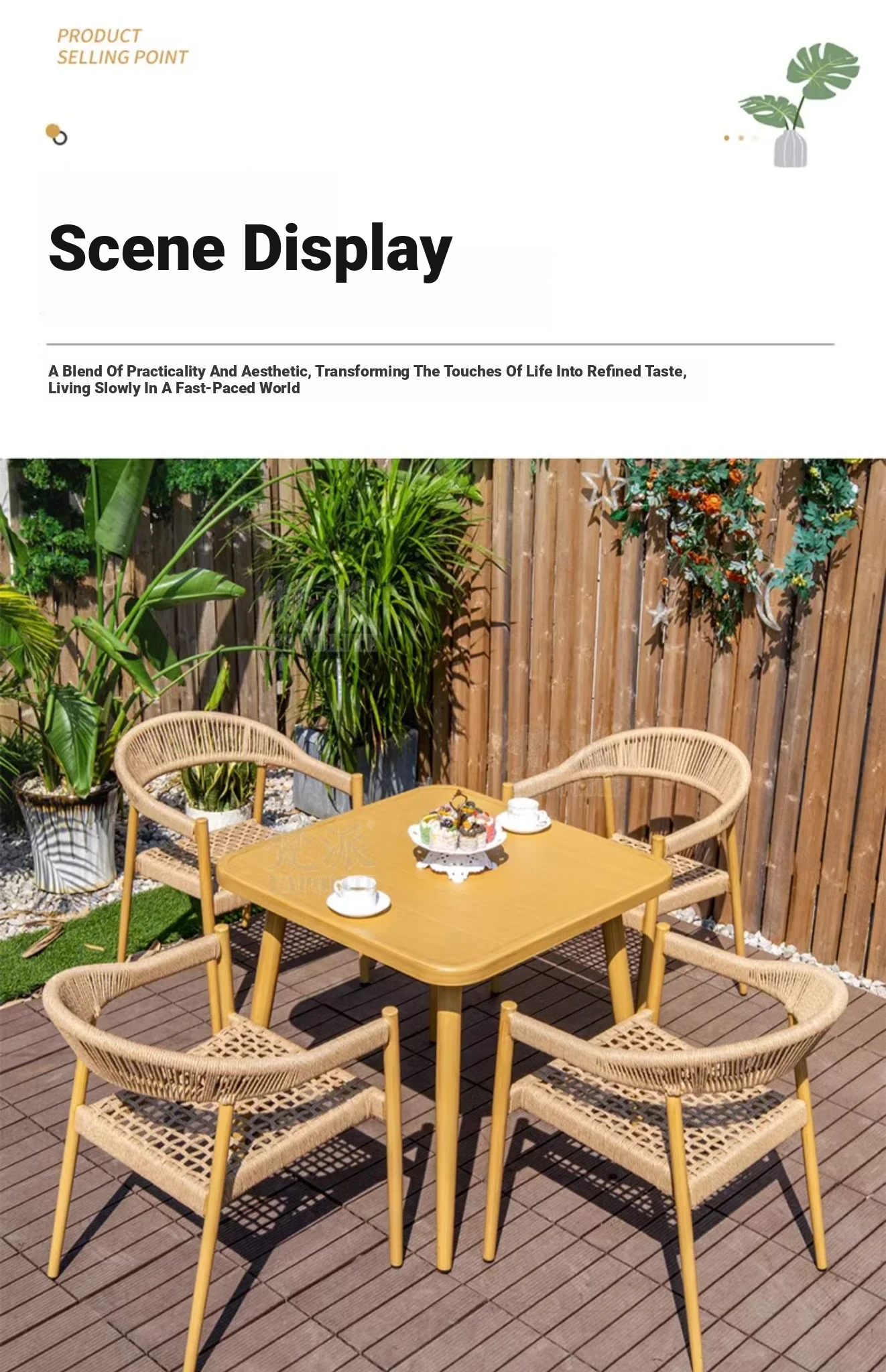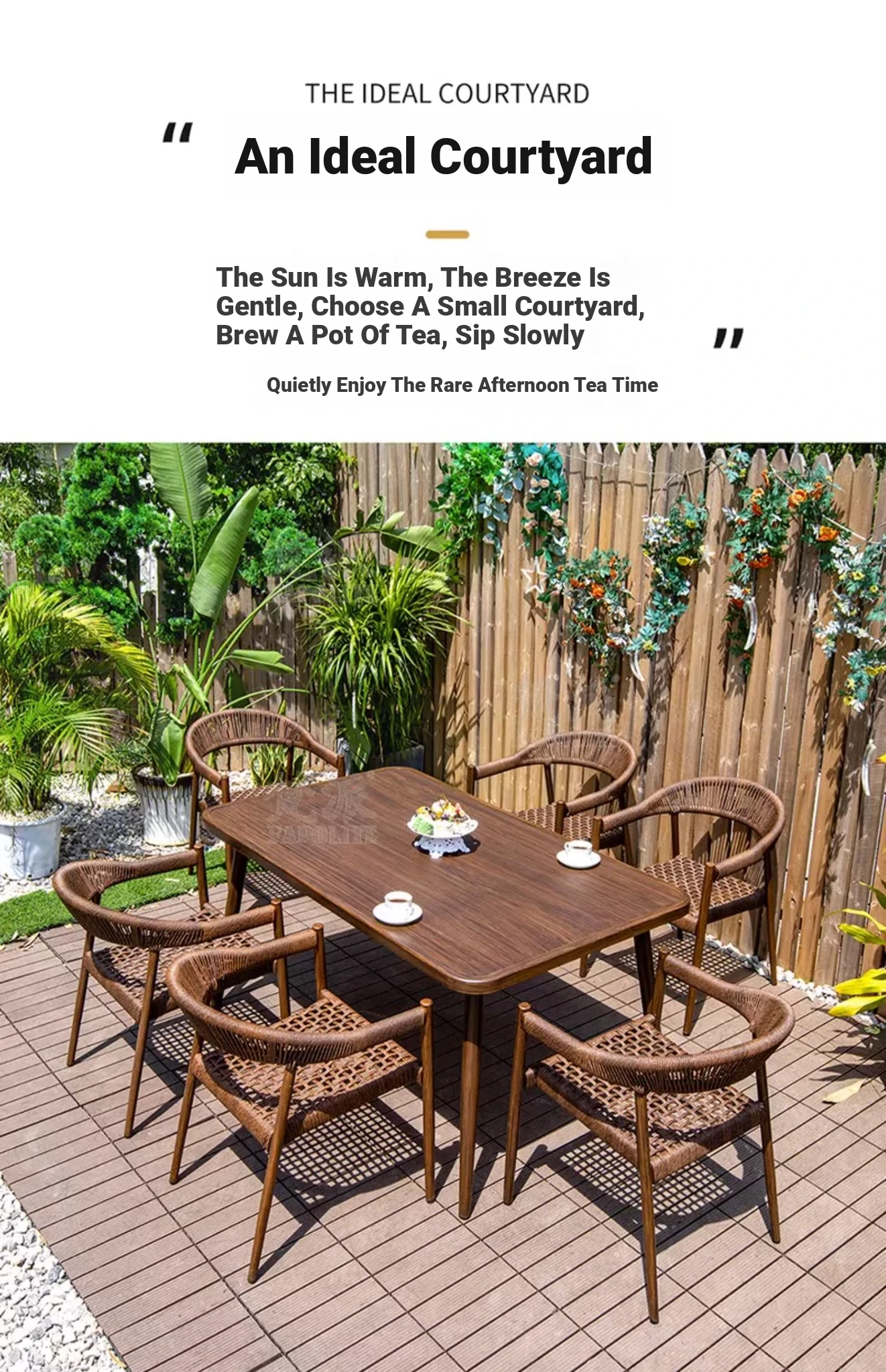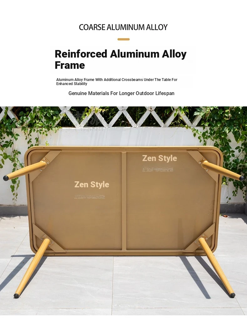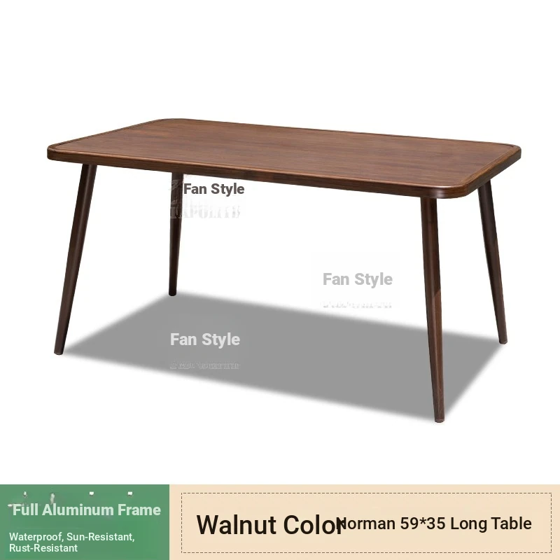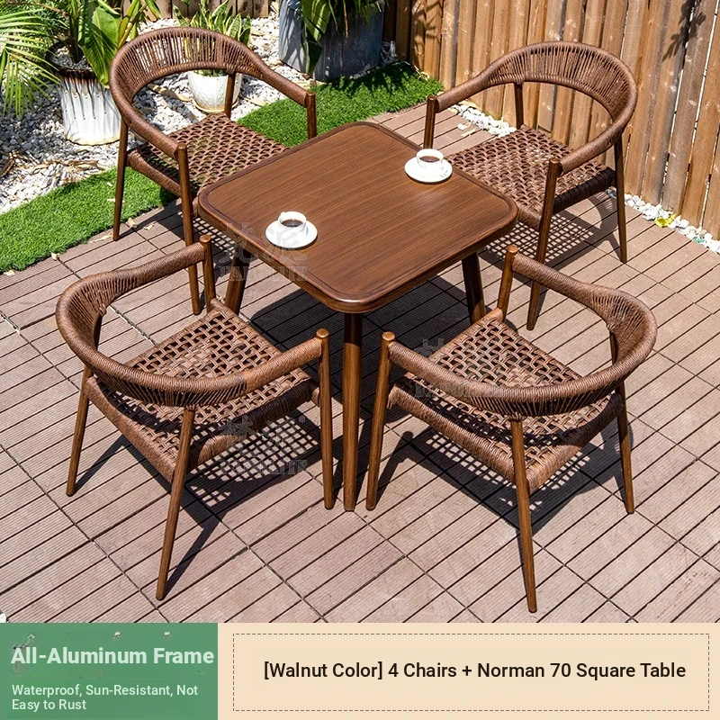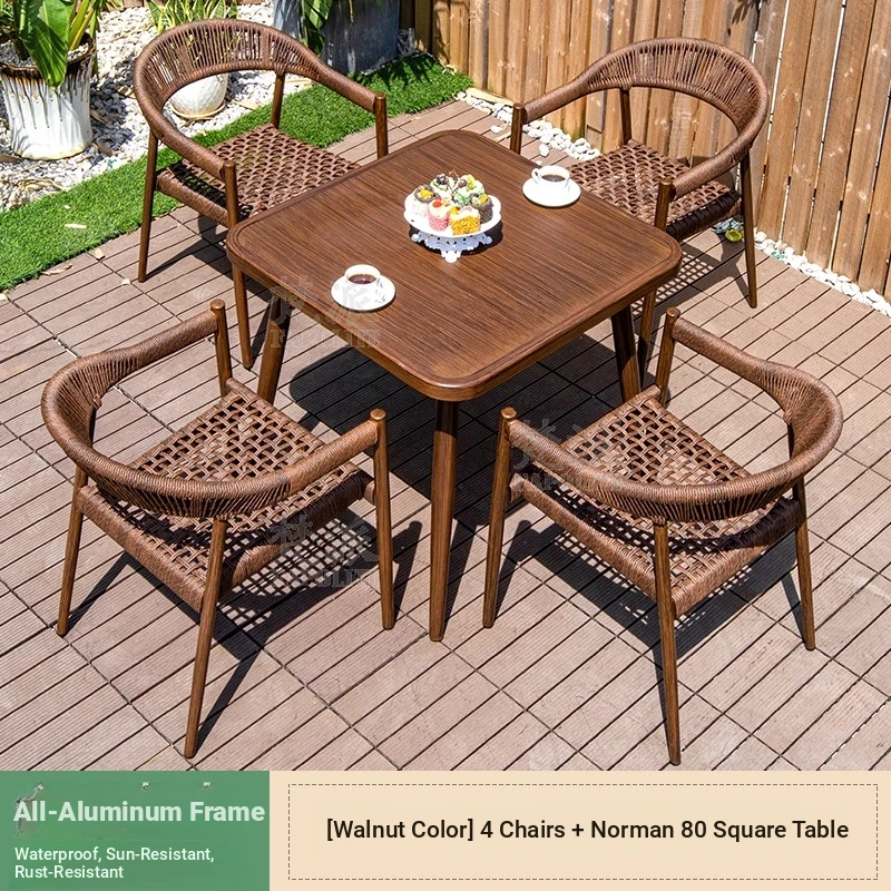 Vibrant Outdoor Patio Furniture Set - Waterproof Aluminum Long Table with Natural Wood Finish and Rattan Chairs for Villa Gardens and Open-Air Spaces