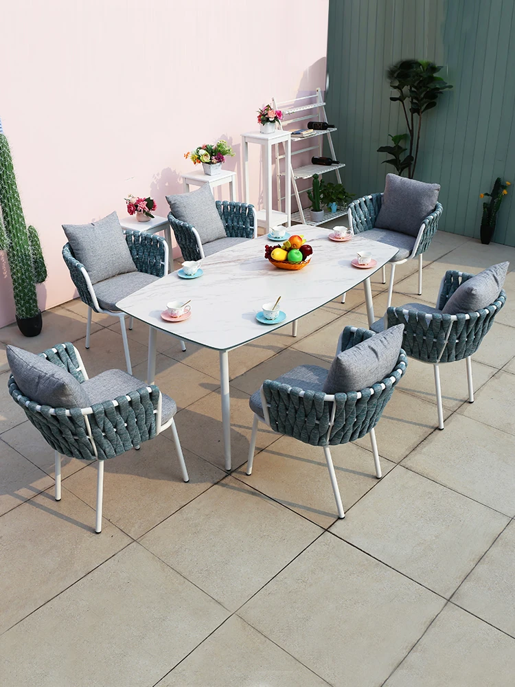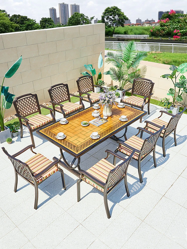 防水・UVカット!おしゃれなガーデンテーブル&チェアセット – アウトドア BBQに最適な長テーブルと透かし彫りのアルミ製椅子が揃った庭やテラスにぴったりのリラックス空間を演出します。