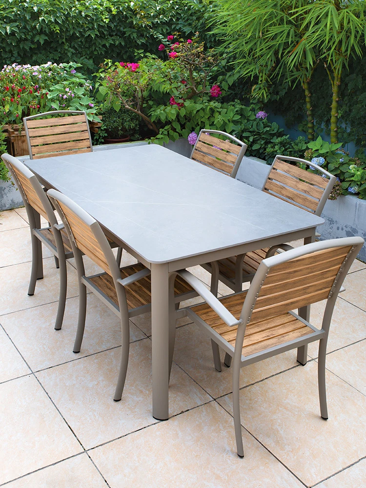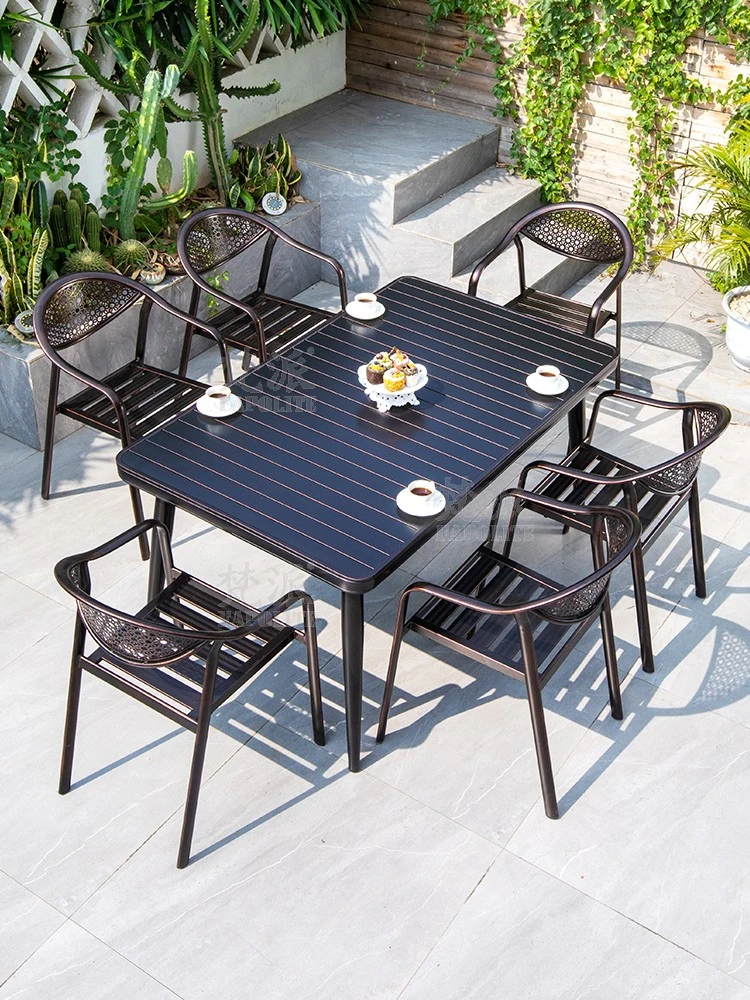 高級感あふれる庭用プラスチックウッドテーブル&チェアセット - 防水・日焼け防止!屋外用ロングテーブルで、バルコニーやガーデンでの特別なひとときを演出します。