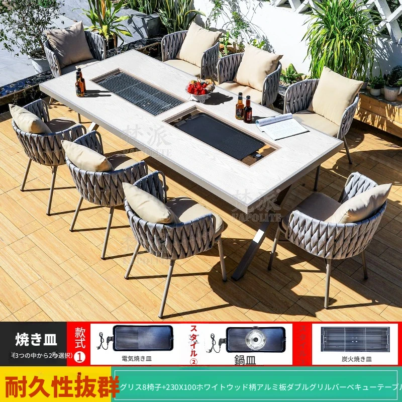 ヴァンパイ庭園用アウトドアテーブル&チェアセット!バーベキューに最適な電気&炭焼き両用テーブル。別荘や庭にぴったりのアルミ合金製、耐久性抜群でおしゃれなデザイン!